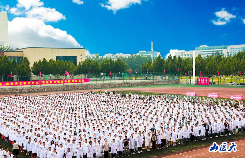 成晓龙领誓《医学生誓言》。全体新生身穿圣洁的白大褂整齐排列,高举右拳庄严宣誓,接受作为一名医学生的精神洗礼,誓言铿锵,响彻校园。