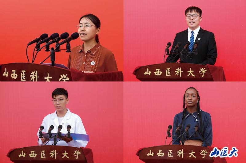第二临床医学院临床医学专业博士研究生郭子瑊同学、第一临床医学院临床医学专业段云斐同学、尼日利亚籍国际学生吴悦同学作为2024级新生代表先后发言。他们表示,要勤学笃行,努力早日成长成才,深耕于医药卫生事业,用所学所能回馈社会,为医学事业的传承与发展贡献力量。