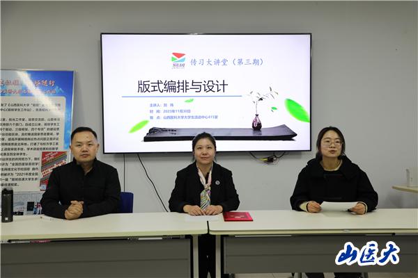 11月30日晚,学生工作部易班学生工作站在中都校区大学生活动中心415室举办了第三期“传习大讲堂”——版式编排与设计。培训由山西应用科技学院副教授刘玮主讲,学生工作部副部长杨洁出席,易班学生工作站指导老师王玉男主持,易班学生工作站成员参加培训。