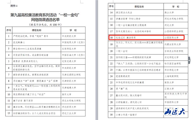 11月5日,教育部发布《关于第九届高校廉洁教育系列活动结果的公示》。经省教育厅推荐,教育部组织专家遴选,山西省共有7所高校报送的9个项目进入遴选名单。其中,由我校党委宣传部、马克思主义学院牵头报送的两个项目入选,入选项目数位居全省高校之首。其中,“红色记忆 廉洁传承”入选“一校一金句”网络微课遴选名单,“红色记忆 廉洁传承——红色廉洁教育的‘情境体验’课程实践”入选课堂实践案例遴选名单。入选项目将在央视网、中国大学生在线、中国教育发布等平台进行展播。